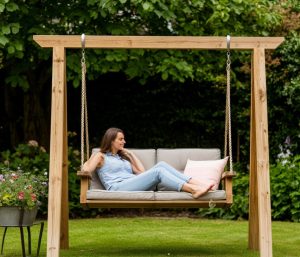 Деревянные качели создают уютную атмосферу, органично вписываются в зелёный ландшафт и идеально подходят для классических или загородных стилей. Основной минус — необходимость регулярного ухода: обработка защитными средствами, периодическая покраска и защита от влаги и насекомых.